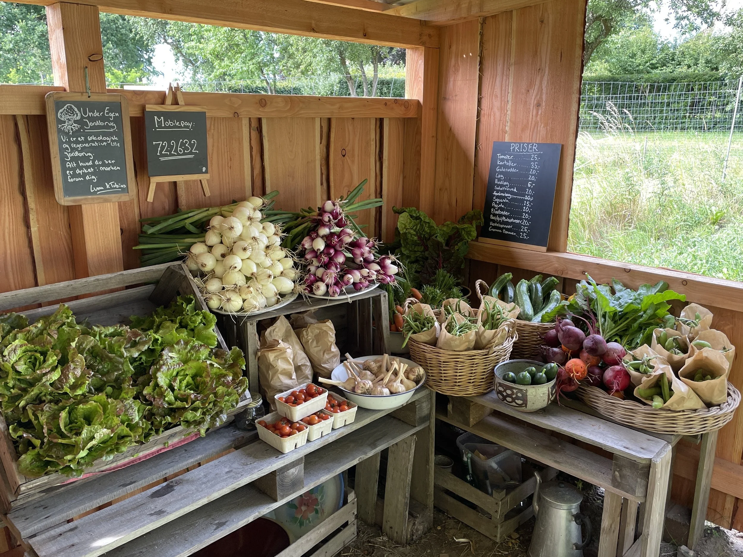 Fra maj til oktober, har vi en ubemandet gårdbod ved vores mark på Oremandsgaard Gods.