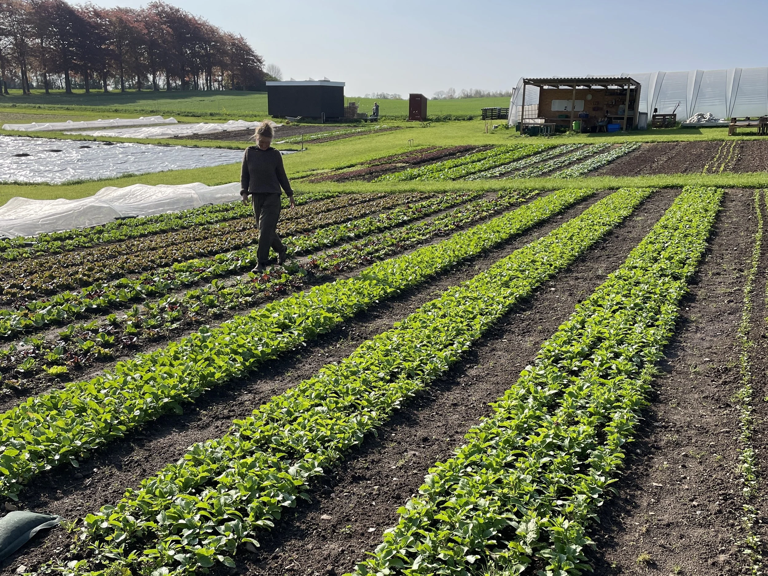 Vi dyrker vores jord efter regenerative principper og så er økologisk certificerede. Vores mark er modelleret efter markedshave-modellen med faste bede i mindre sektioner. I denne sæson har vi ti sektioner med tyve faste bede som er 15 meter lange. Derudover har vi en polytunnel/drivhus på 156m2 som hele sommeren er fyldt med tomater.