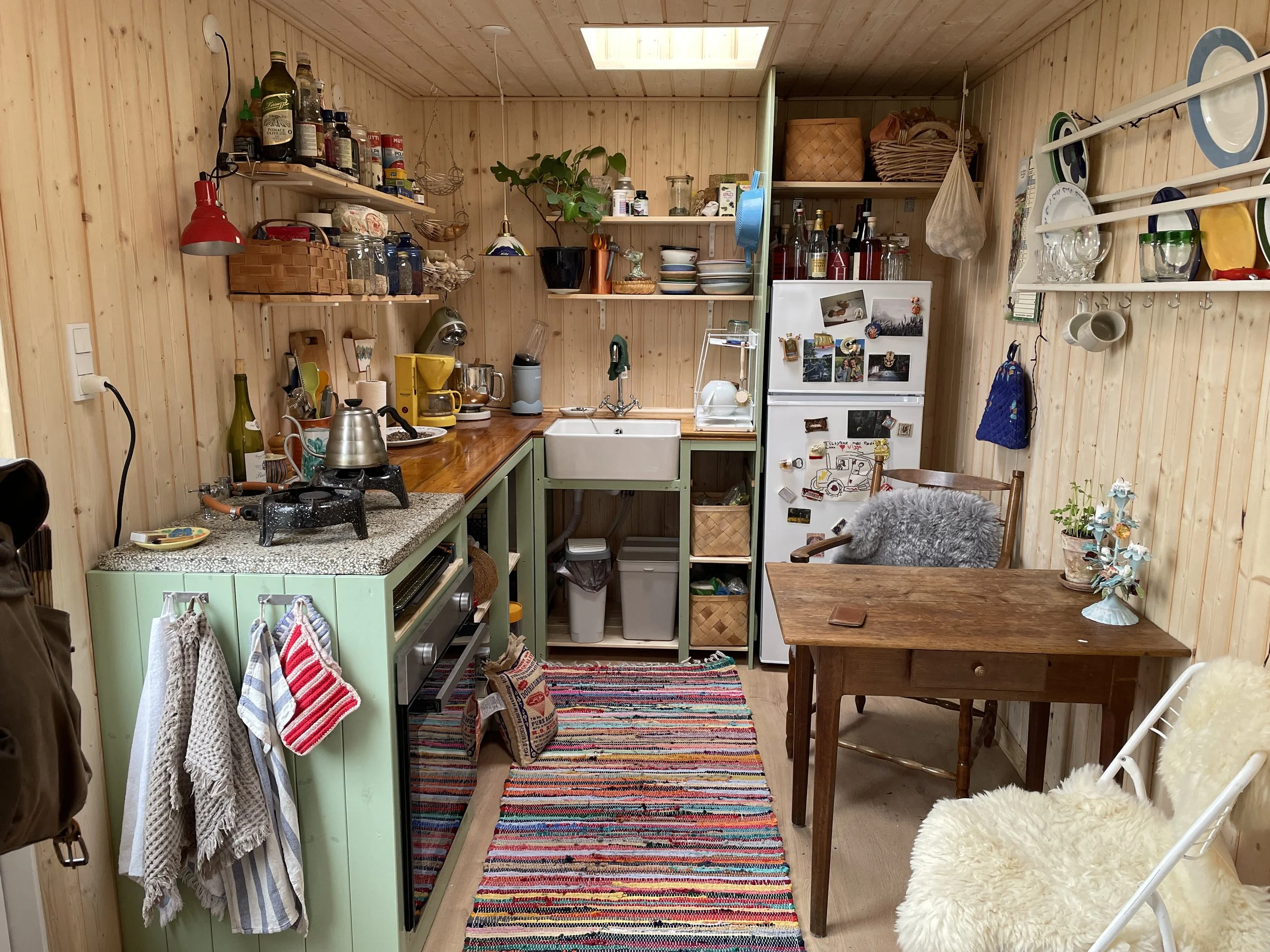 I en kort periode i 2025 var vi hjemløse, eller altså - næste. For vi nåede at købe en skurvogn og gøre den til et lille hjem. Nu har vi så fået et rigtigt hjem og derfor står ‘skurvognen’, som vi kalder den, klar til at huse dig! Den er på 13m3, godt isoleret og med en lille radiator. Derudover har den rindende koldt og varmt vand, køleskab, en ovn og to gasblus og udebruser med varmt vand.